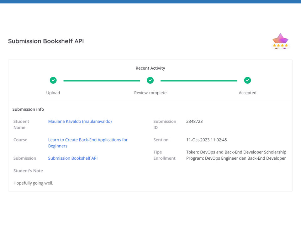 By completing this project, I will earn a certificate from dicoding.com as evidence of successfully mastering the fundamental topics of back-end application development. The Bookshelf API is designed to be integrated with various front-end applications or other services that require access to book data, using technologies such as Node.js, Express.js, and either NoSQL or SQL databases to store book data. Additionally, the API can implement authentication and authorization techniques to ensure secure access to book data.
